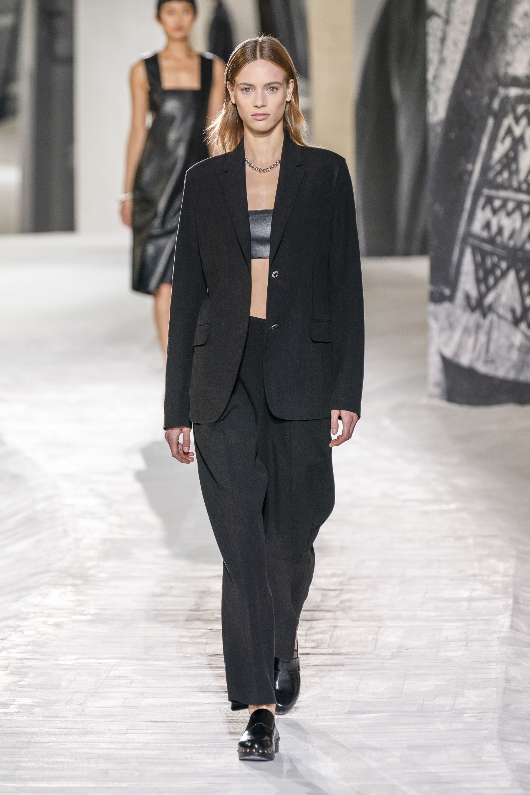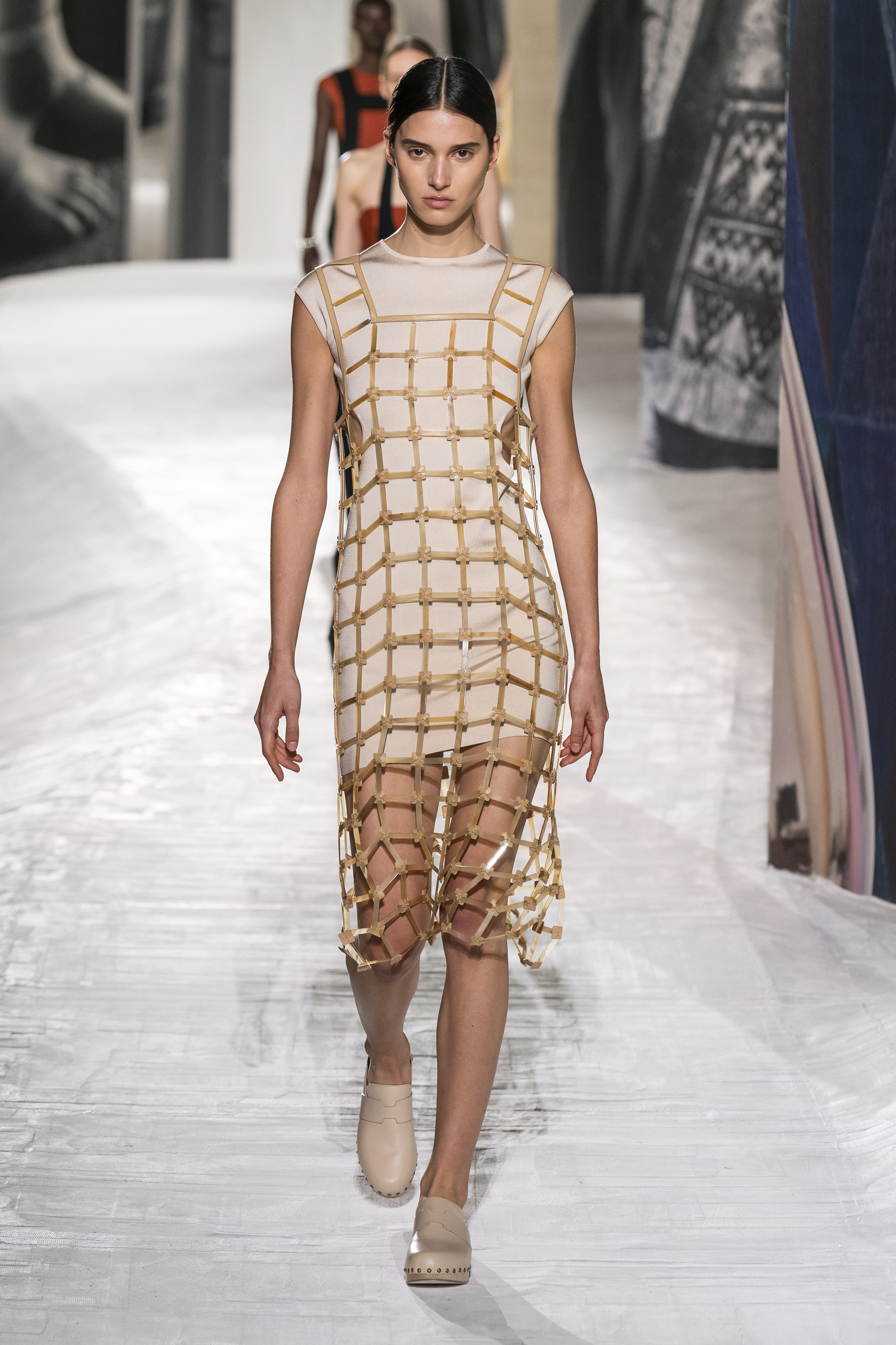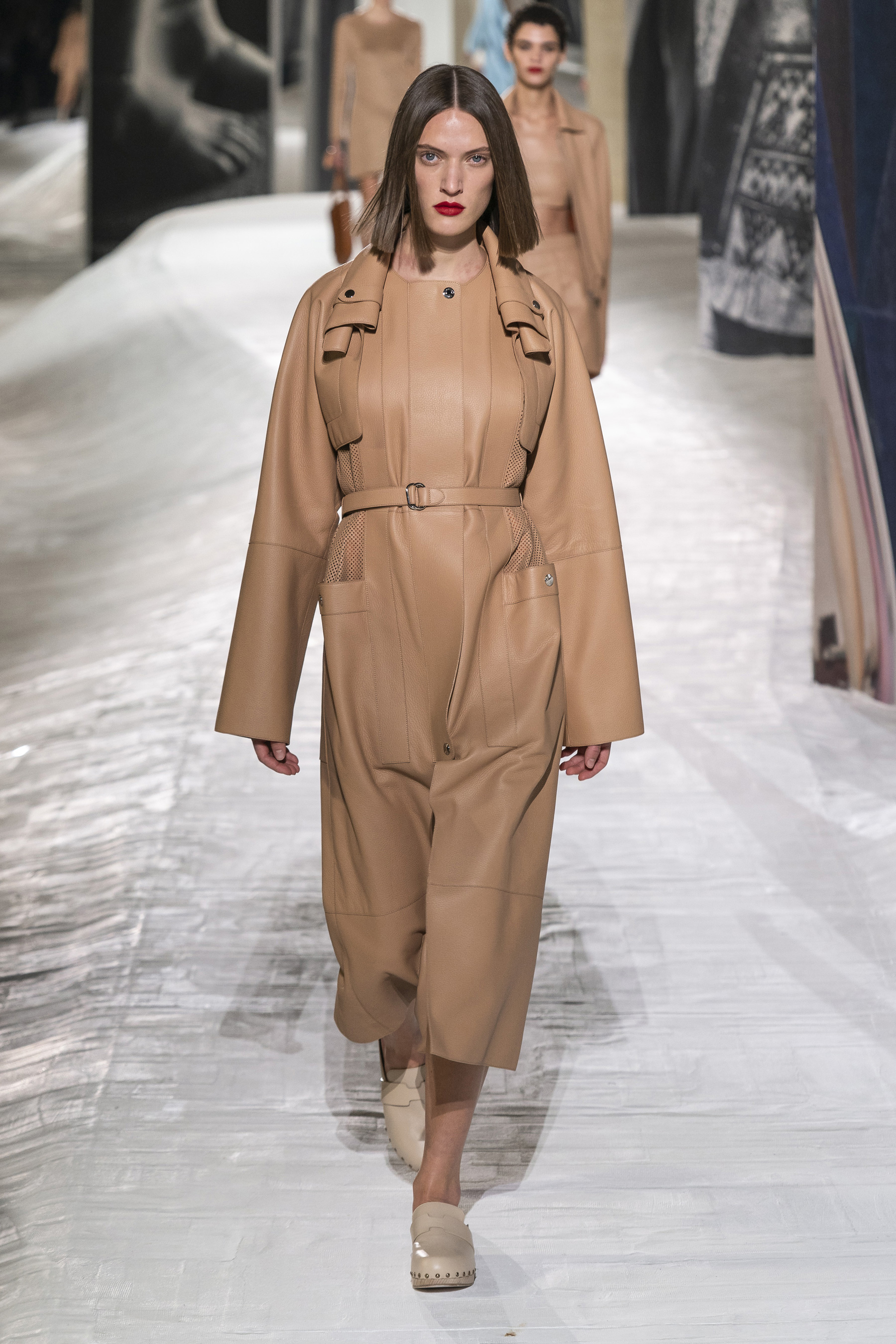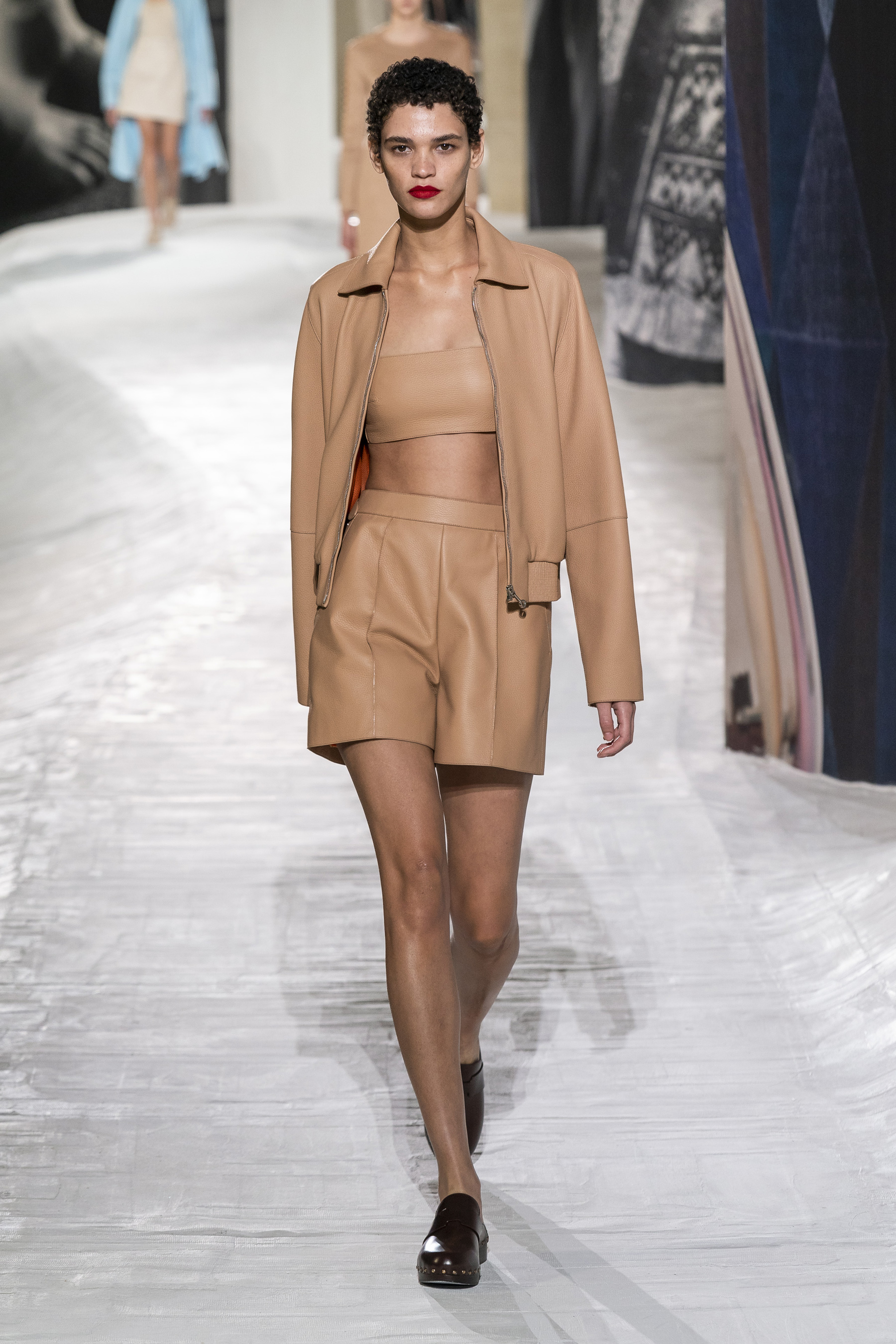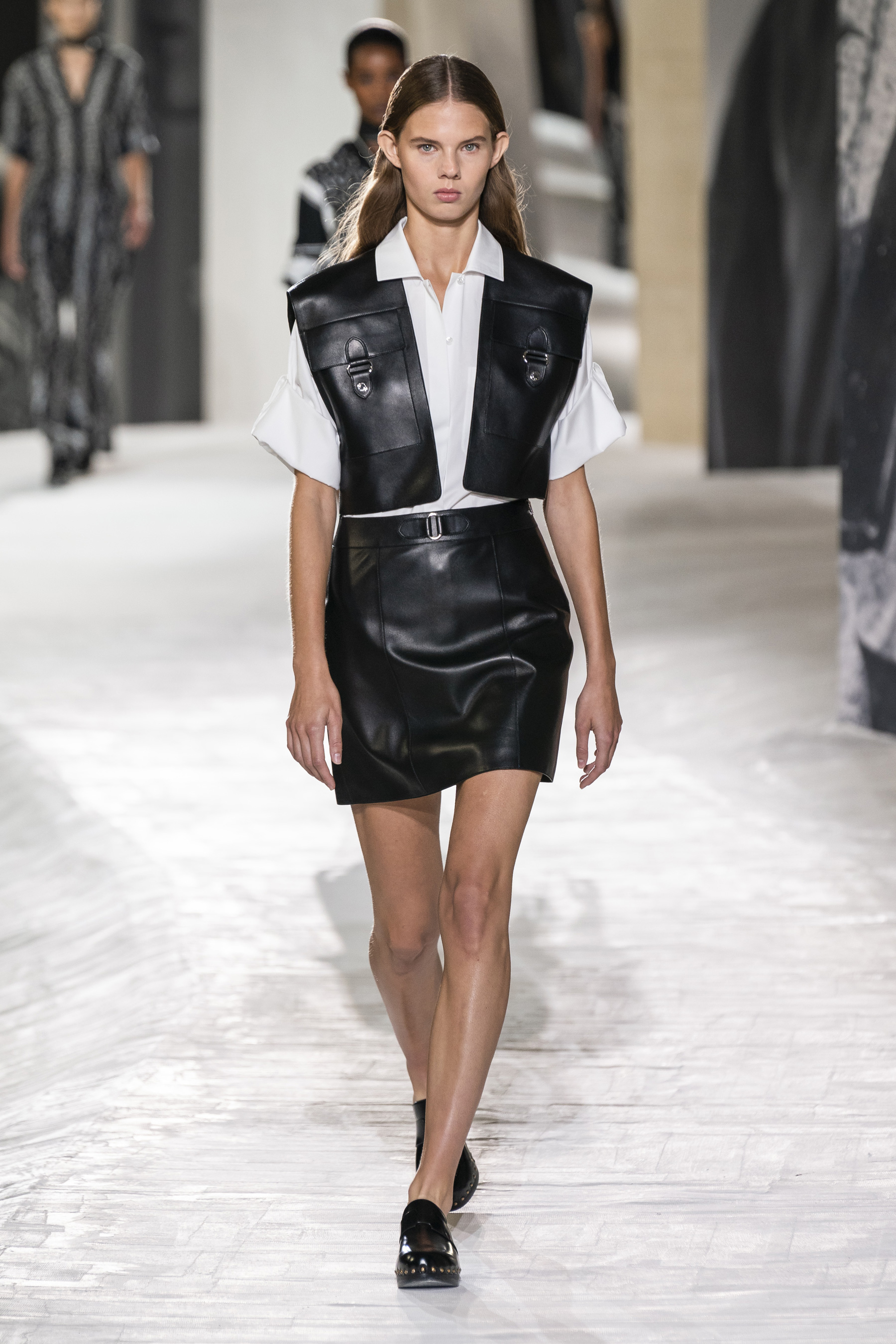 Φυσικά, πρωταγωνιστικό ρόλο είχε το μαλακό δέρμα που είδαμε σε φούστες σε γραμμή άλφα, γιλέκα, πανωφόρια, ολόσωμες φόρμες, αλλά και σε παπούτσια και τσάντες. Πλεκτά φορέματα αλλά και bodies που έμοιαζαν με μαγιό είχαν αναφορές στην αρχαία ελληνική τέχνη της κεραμοποιίας, ενώ ακόμα και το σκηνικό, όπου τα μοντέλα στέκονταν ακίνητα στην αρχή του show, έμοιαζε με φόρο τιμής σε αρχαιοελληνικούς μισογκρεμισμένους ναούς.