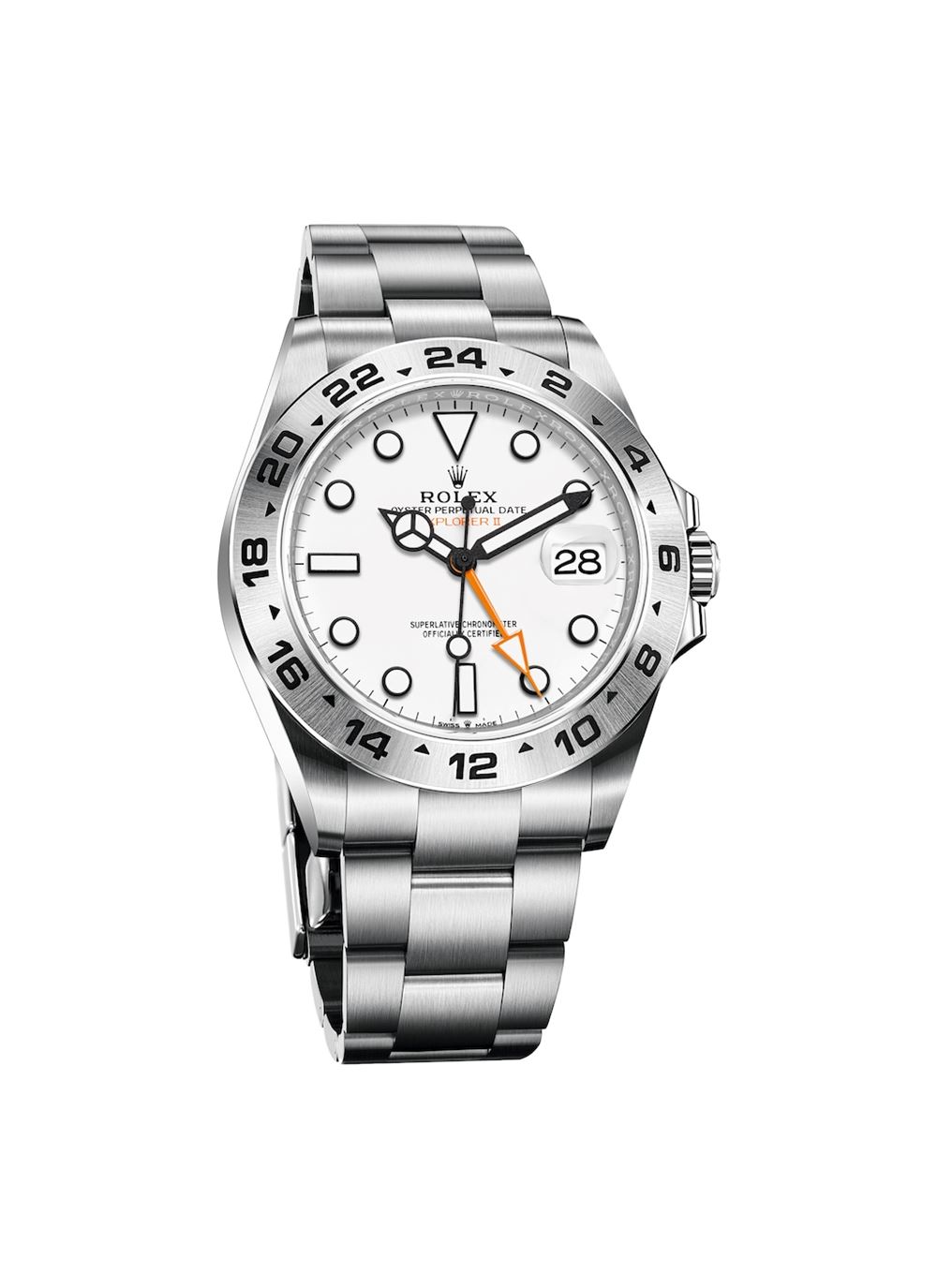 Το Oyster Perpetual Explorer II παρουσιάζεται με επανασχεδιασμένη κάσα διαμέτρου 42mm. Φοράει μπρασελέ από ατσάλι Oystersteel, ένα μοναδικό κράμα - αποκλειστικότητα της Rolex - που προσφέρει ασύγκριτη ανθεκτικότητα καθώς και λάμψη στο ρολόι. Η χαρακτηριστική στεφάνη με χαραγμένη 24ωρη απεικόνιση της ώρας, ευδιάκριτη και εξαιρετικά ανθεκτική στη διάβρωση, παραμένει το βασικό χαρακτηριστικό του Οyster Perpetual Explorer II.