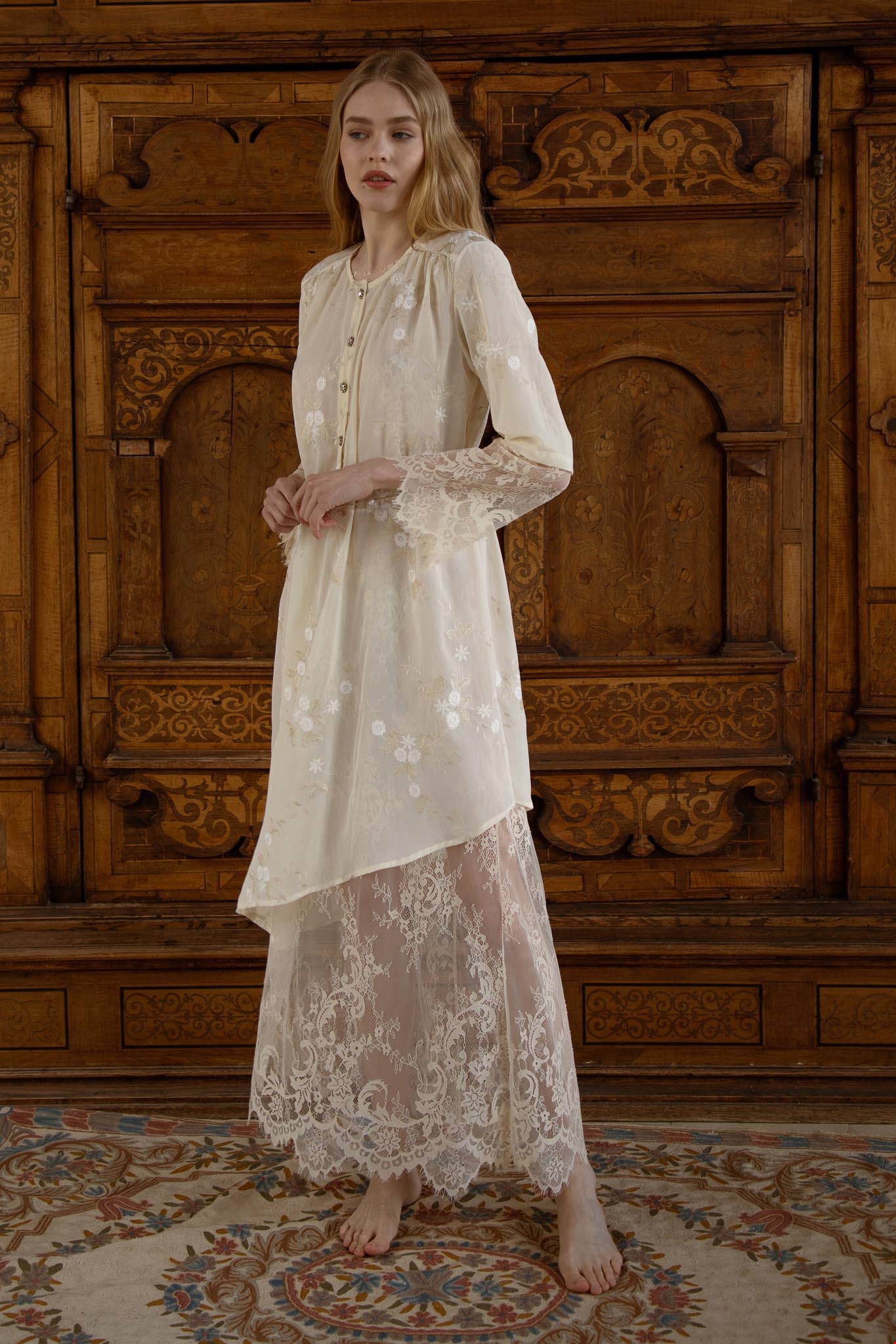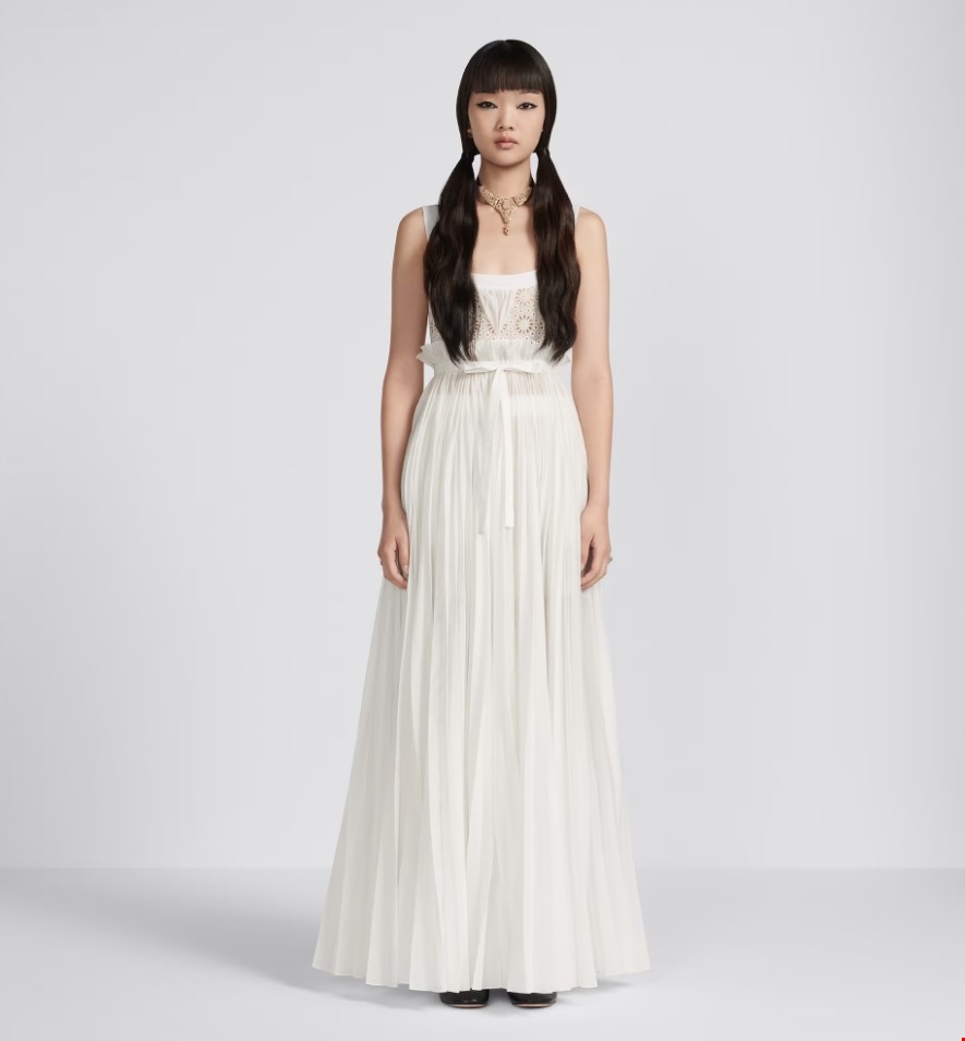 Η απόλυτα σύγχρονη νύφη συνδύασε το δαντελένιο, minimal φόρεμα με το κλασσικό κόψιμο, με χρυσά πέδιλα Gianvito Rossi, διαμαντένιο κολιέ Anita Ko και με μια λιτή ανθοδέσμη με λευκά λουλούδια από ένα deli της γειτονιάς. Μετά την τελετή φόρεσε ένα κρεμ ζευγάρι γυαλιά ηλίου και ένα λευκό blazer.