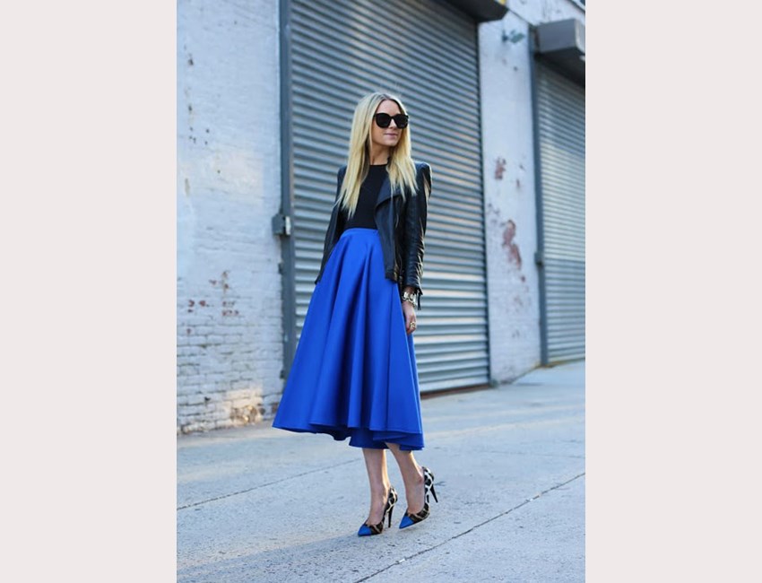Η blogger του Atlantic-Pacific με μπλέ full skirt.