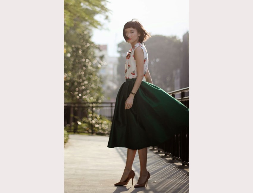 Η blogger Ulimali με πράσινη, σατέν full skirt.