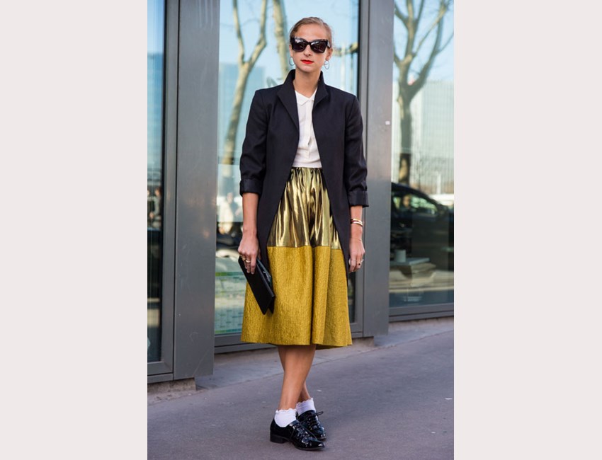 Full skirt συνδυασμένη με brogues και oversized σακάκι.