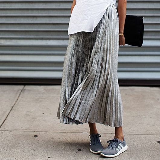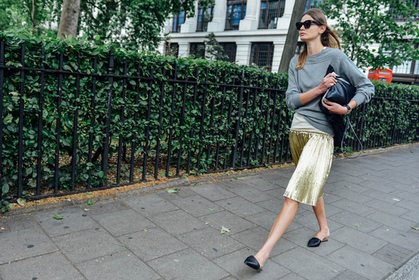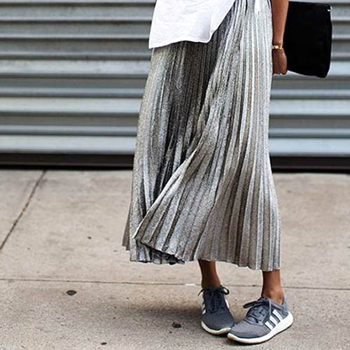 H αλήθεια είναι πως το μεταλλιζέ κομμάτι που θα συναντήσεις πιο συχνά, είναι η μεταλλιζέ φούστα. Πες "ναι" σε κάποια midi πλισέ, την οποία θα συνδυάσεις κατά προτίμηση με neutral χρώματα (το καλοκαίρι το λευκό δείχνει πάντα συγκλονιστικό).