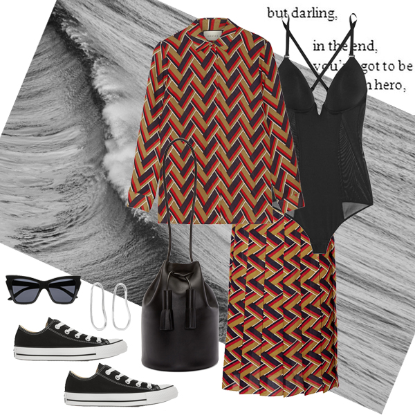 Πουκάμισο και φούστα Gucci, GUCCI BOUTIQUE. Sneakers CONVERSE. Τσάντα ώμου Building Block, SSENSE.COM. Bodysuit COSABELLA. Γυαλιά ηλίου Le Specs, NET-A-PORTER.COM. Σκουλαρίκια Sophie Buhai, ΝΕΤ-Α-PORTER.COM.