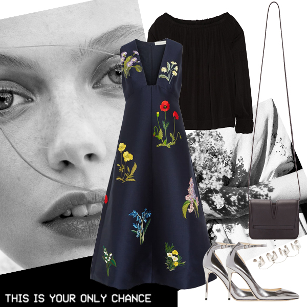 Φόρεμα Stella McCartney, LUISA. Toπ Donna Karan New York, NET-A-PORTER.COM. Τσάντα ώμου Jil Sander, SSENSE.COM. Παπούτσια Jimmy Choo, KALOGIROU.COM. Δαχτυλίδια Maison Margiela, FARFETCH.COM.