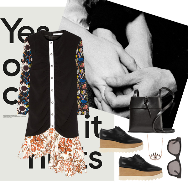 Φόρεμα J.W. Anderson, NET-A-PORTER.COM. Flatforms Stella McCartney, LUISA. Τσάντα ώμου Kara, NET-A-PORTER.COM. Pendant La Vie Jewelry, AESTHET.COM. Γυαλιά ηλίου Sun Buddies, MYTHERESA.COM.