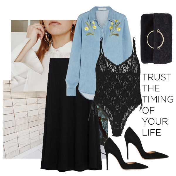 Denim πουκάμισο Stella McCartney, LUISA. Φούστα με σκισίματα ZARA. Γόβες Gianvito Rossi, KALOGIROU.COM. Clutch Victoria Beckham, MYTHERESA.COM. Bodysuit Hanky Panky, NET-A-PORTER.COM.