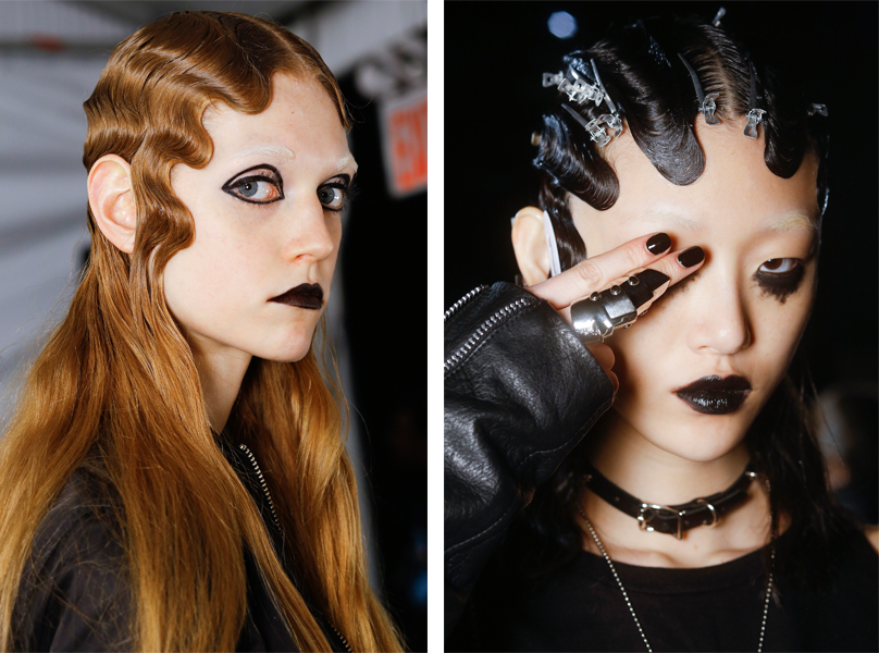 Μαλλιά χτενισμένα σε 40's vague, έντονο μαύρο eyeliner και σκούρα χείλη, ήταν η βασική γραμμή που ο Αμερικανός σχεδιαστής έδωσε για το beauty κομμάτι του show.