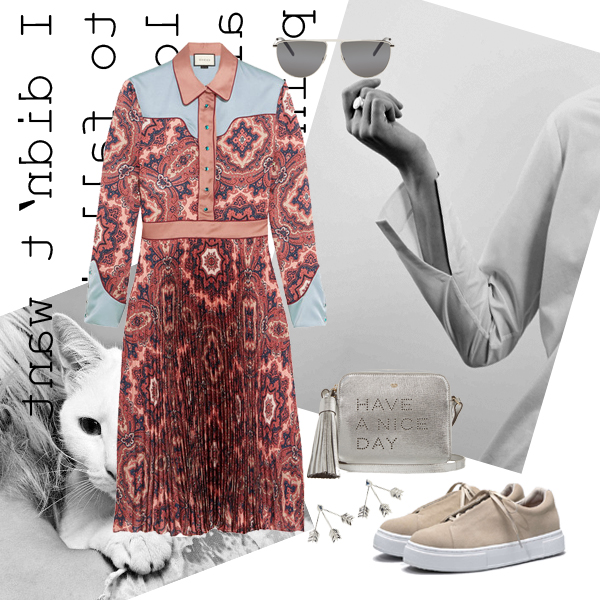 Φόρεμα Gucci, GUCCI BOUTIQUE. Τσάντα ώμου Anya Hindmarch, MATCHESFASHION.COM. Sneakers Eytys, EYTYS.COM. Γυαλιά ηλίου Saint Laurent, LUISA. Σκουλαρίκια Pamela Love, SSENSE.COM.