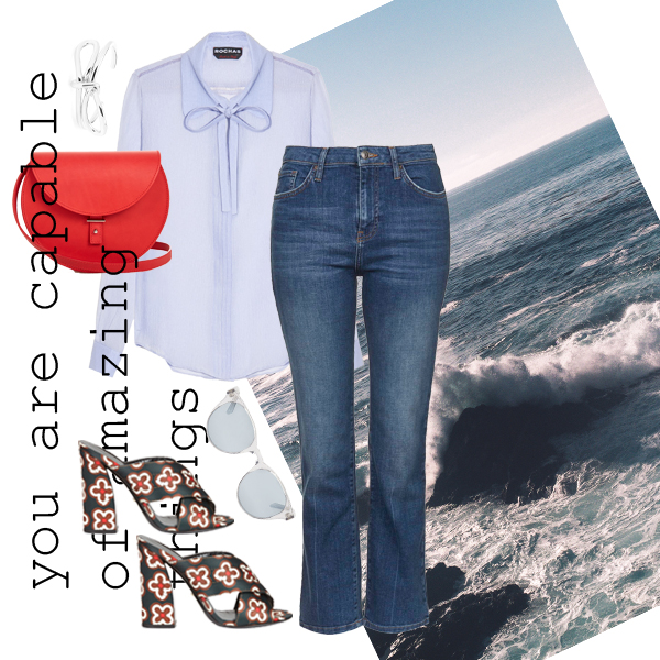 Πουκάμισο Rochas, MATCHESFASHION.COM. Cropped denim Topshop, TOPSHOP.COM. Tσάντα ώμου Pb 0110, MATCHESFASHION.COM. Ψηλοτάκουνα mules Gucci, GUCCI BOUTIQUE. Cuff Balenciaga, BALENCIAGA BOUTIQUE. Γυαλιά ηλίου Sun Buddies, SSENSE.COM.