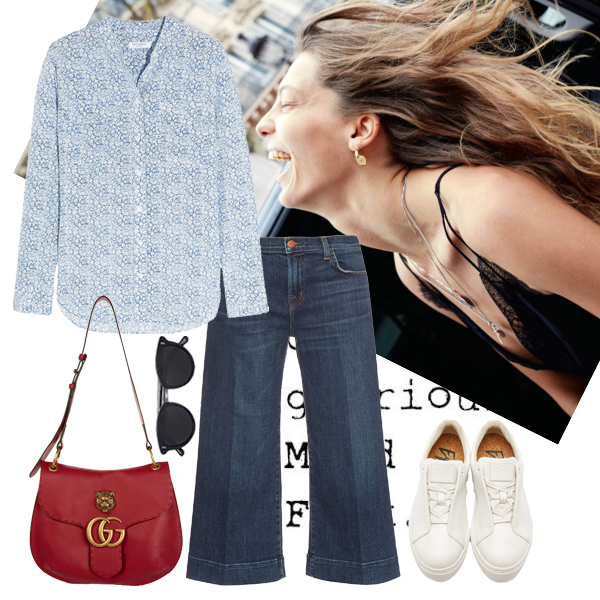 Πουκάμισο Equipment, NET-A-PORTER.COM. Denim culottes J. Brand, MATCHESFASHION.COM. Τσάντα ώμου Gucci, GUCCI BOUTIQUE. Sneakers Eytys, SSENSE.COM. Γυαλιά ηλίου Oliver Peoples, LUXOTTICA HELLAS.