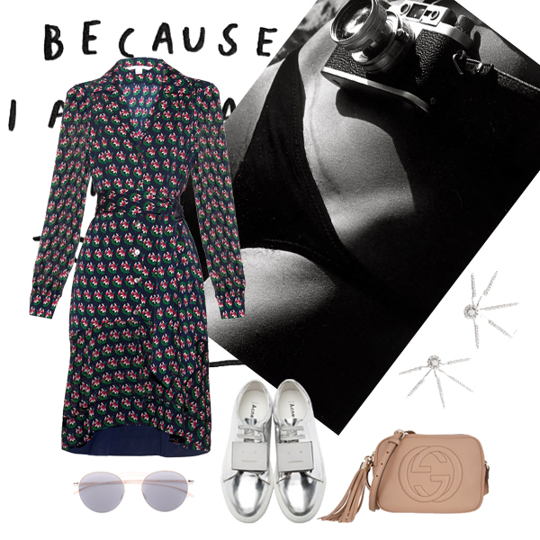 Φόρεμα Diane Von Furstenberg, MATCHESFASHION.COM. Sneakers Acne Studios, SSENSE.COM. Τσάντα Gucci, GUCCI BOUTIQUE. Γυαλιά ηλίου Mykita, FARFETCH.COM. Σκουλαρίκια Kenneth Jay Lane, NET-A-PORTER.COM.