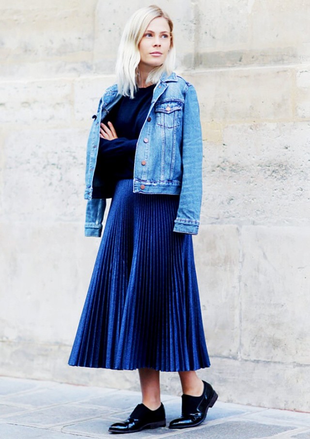 Ένα denim jacket εξισορροπεί το glam effect της πλισέ φούστας σε μεταλλική απόχρωση. Φωτογραφία: We The People
