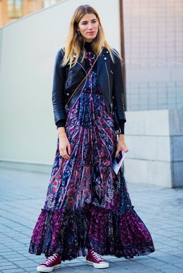 Oι περισσότερες fashion insiders ακολουθούν πιστά ένα συγκεκριμένο styling, όσον αφορά το αγαπημένο τους floral, maxi φόρεμα: high top sneakers και δερμάτινο jacket για girlie εμφανίσεις με twist. Φωτογραφία: Style Du Monde