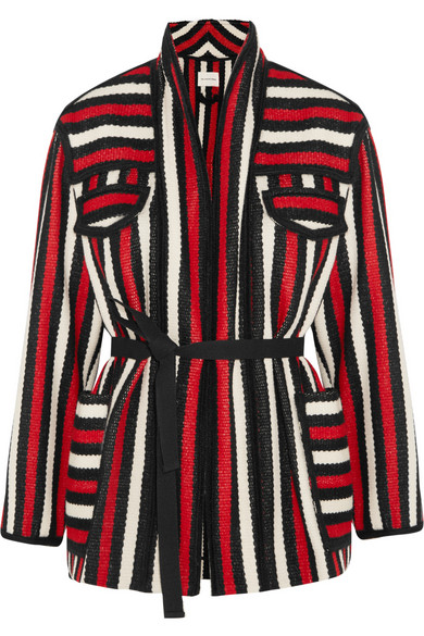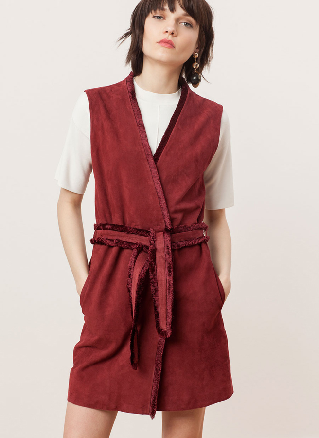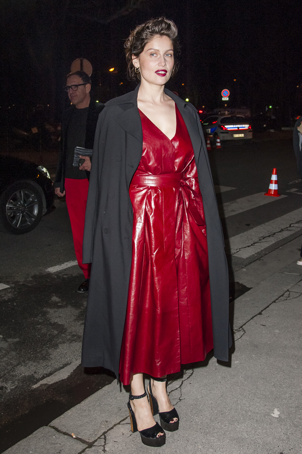 Η Laeticia Casta με δερμάτινο, κόκκινο φόρεμα και μαύρη καπαρντίνα.