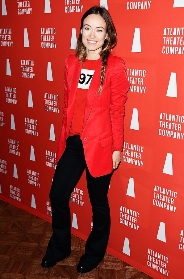 Η Olivia Wilde με μαύρο παντελόνι καμπάνα, κόκκινο Smythe blazer και πουλόβερ Bella Freud