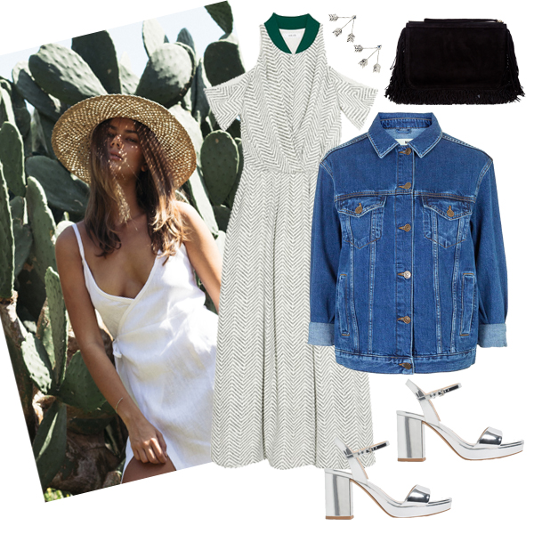 Φόρεμα Adeam, NET-A-PORTER.COM. Denim jacket Topshop, TOPSHOP.COM. Ψηλοτάκουνα πέδιλα ZARA. Clutch με κρόσια Pierre Hardy, MATCHESFASHION.COM. Σκουλαρίκια Pamela Love, SSENSE.COM.