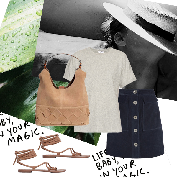 Τ-shirt Frame Denim, MATCHESFASHION.COM. Σουέτ φούστα MiH Jeans, NET-A-PORTER.COM. Σανδάλια ΜΑΝGO. Τσάντα H&M.