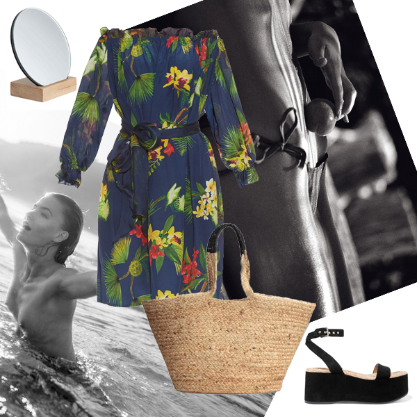 Φόρεμα Ιsolda, MATCHESFASHION.COM. Πλατφόρμες Sam Edelman, NET-A-PORTER.COM. Στρογγυλός καθρέφτης H&M HOME. Ψάθινη τσάντα H&M.