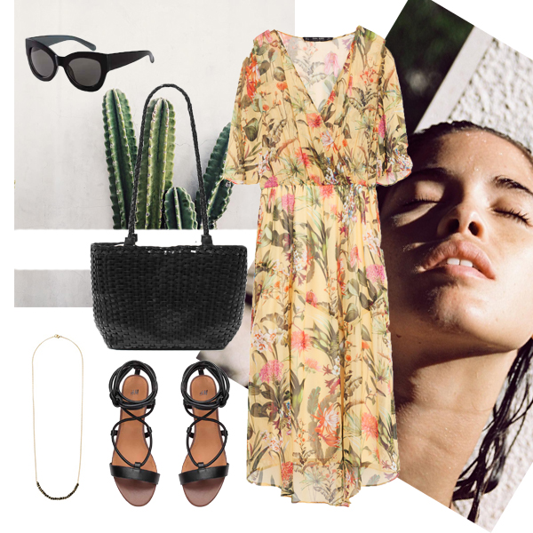 Φόρεμα ZARA. Σανδάλια Valia Gabriel, VALIAGABRIEL.COM. Τσάντα Chiyome, SSENSE.COM. Γυαλιά ηλίου OYSHO. Δαχτυλίδι Venyx, NET-A-PORTER.COM.