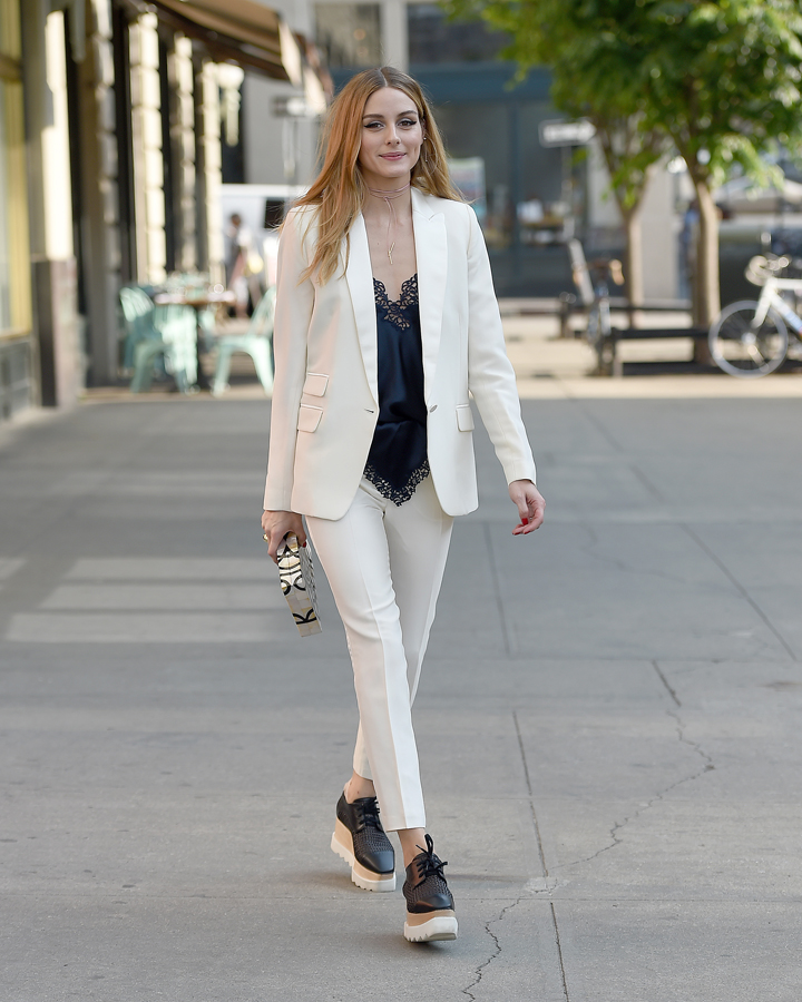Ένα σατέν τοπ μέσα από το σακάκι σου (όπως αυτό της Olivia Palermo), μπορεί να χαρίσει την θηλυκή νότα που χρειάζεται το look σου για να απογειωθεί.