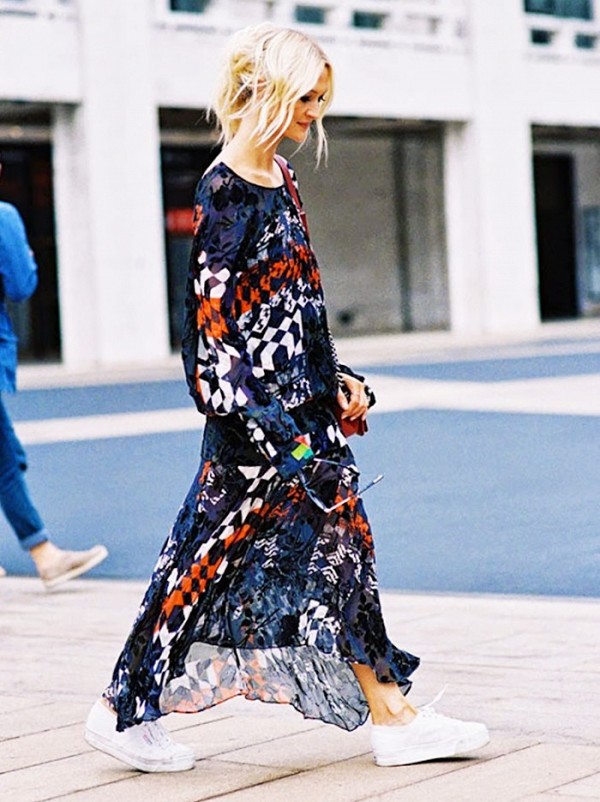 Εξισορρόπησε ένα θηλυκό, μάξι, φλοράλ φόρεμα με την βοήθεια των sneakers.