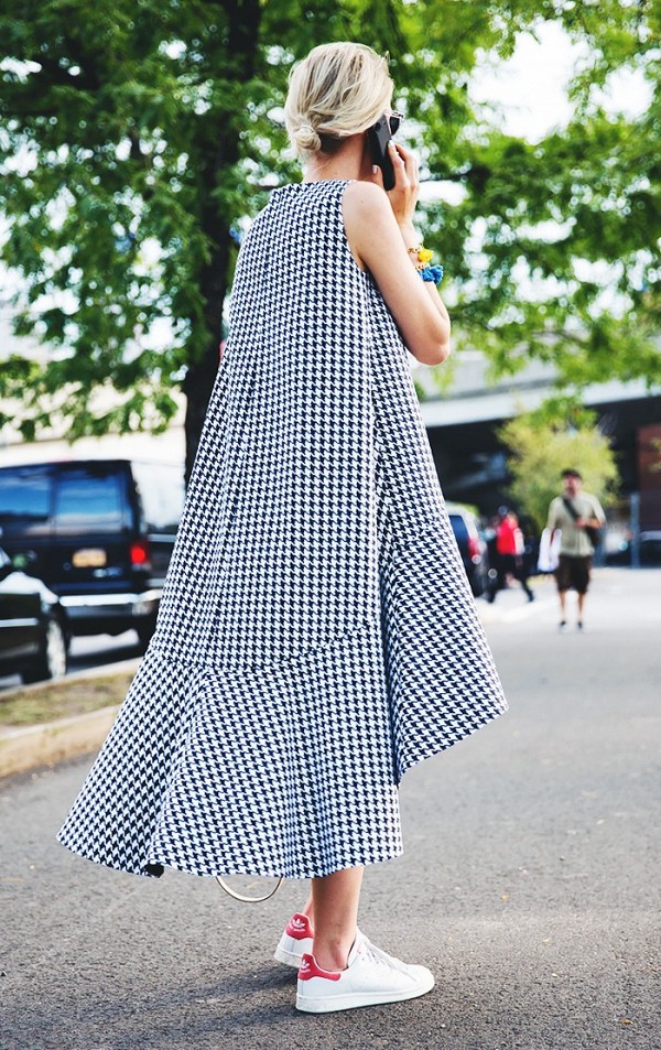 Μη φοβάσαι να πειραματιστείς με τα χρώματα ή με τα πατρόν των φορεμάτων σου, εάν στο παιχνίδι υπάρχουν κάπου και τα ολόλευκα sneakers σου.