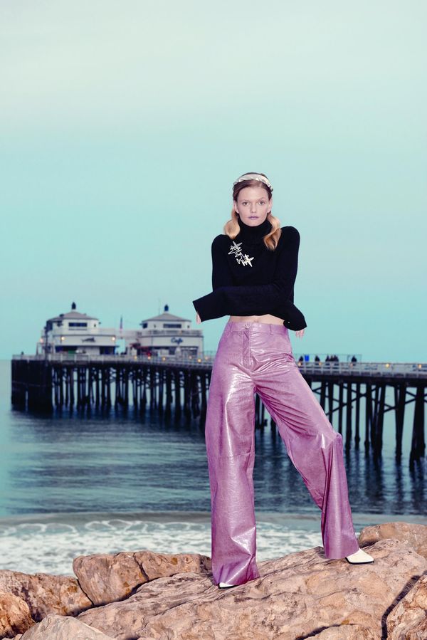 Πουλόβερ, MICHAEL KORS COLLECTION. Δερμάτινο παντελόνι, στέκα και καρφίτσα, όλα Chanel, LINEA PIU. Παπούτσια, PAUL & JOE.