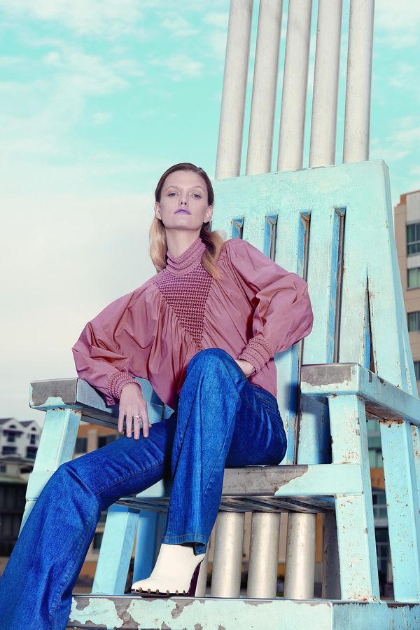 Μπλούζα, FENDI. Τζιν παντελόνι, GERARD DAREL. Δαχτυλίδι, Hermes, HERMES BOUTIQUE. Mules, CELINE.