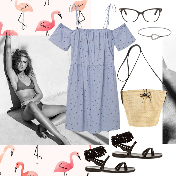 Φόρεμα ZARA. Tσάντα ώμου Kara, NET-A-PORTER.COM. Εspadrilles Kyrvan, KYRVANSHOES.COM. Σκουλαρίκια Melissa Joy Manning, NET-A-PORTER.COM. Γυαλιά ηλίου Italia Independent, SHOW-CASE. Μαντήλι για τον λαιμό H&M. Αρωματικό κερί H&M HOME.
