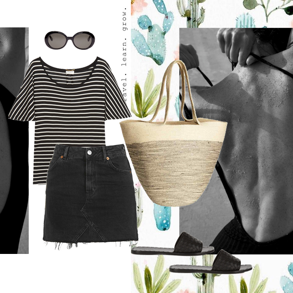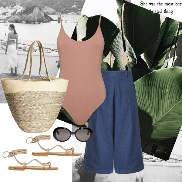 Ολόσωμο μαγιό Μaa Boo, MAABOOSWIMWEAR.COM. Culottes Vathos Apparel, VATHOSAPPAREL.COM. Ψάθινη τσάντα H&M HOME. Σανδάλια K Jacques St Tropez, ΝΕΤ-Α-PORTER.COM. Γυαλιά ηλίου Saint Laurent, LUISA. Σκουλαρίκια Givenchy, SSENSE.COM.
