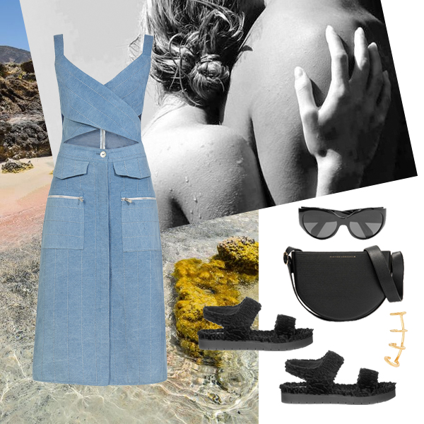 Denim φόρεμα Christina Economou, CHRISTINA-ECONOMOU.COM. Tσάντα ώμου Victoria Beckham, NET-A-PORTER.COM. Σανδάλια Weekend Max Mara, MATCHESFASHION.COM. Γυαλιά ηλίου Oliver Peoples, LUXOTTICA HELLAS. Εar cuff Saint Laurent, FARFETCH.COM.