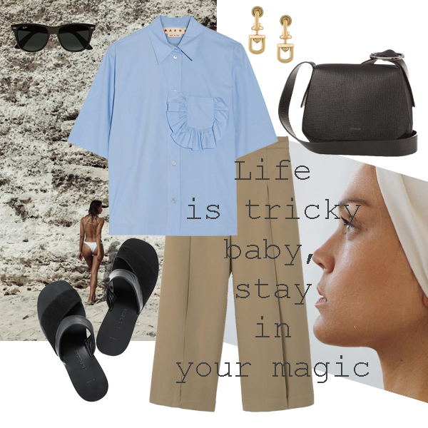 Πουκάμισο Marni, NET-A-PORTER.COM. Παντελόνι MANGO. Σανδάλια Zeus + Δione, ZEUSNDIONE.COM. Τσάντα ώμου Sportmax, MATCHESFASHION.COM. Σκουλαρίκια Eddie Borgo, FARFETCH.COM. Γυαλιά ηλίου Ray - Ban, LUXOTTICA HELLAS.