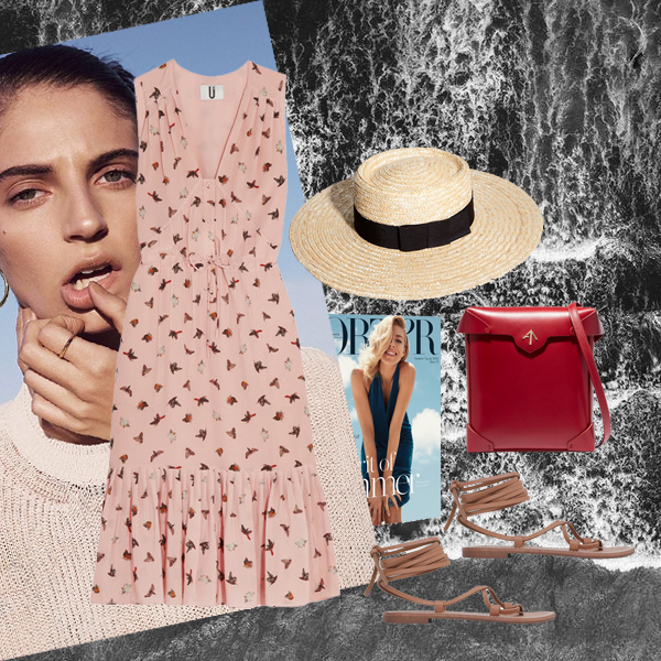 Φόρεμα Topshop Unique, TOPSHOP.COM. Tσάντα ΜΑΝU Atelier, NET-A-PORTER.COM. Σανδάλια MANGO. Καπέλο ZARA HOME. Περιοδικό Porter.