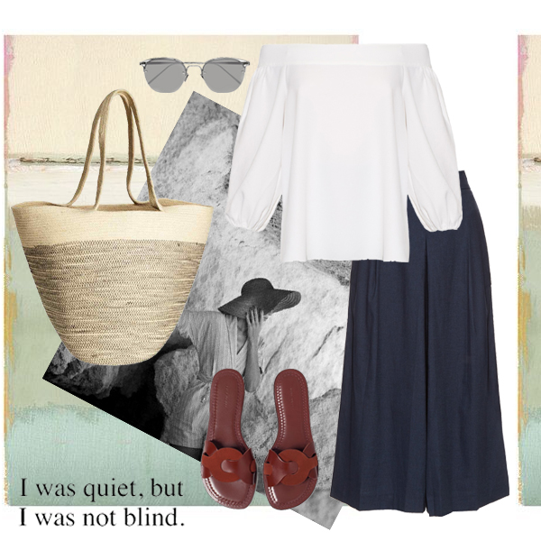 Toπ και culottes Tibi, MATCHESFASHION.COM. Τσάντα H&M HOME. Σανδάλια ZARA. Γυαλιά ηλίου Linda Farrow, NET-A-PORTER.COM.