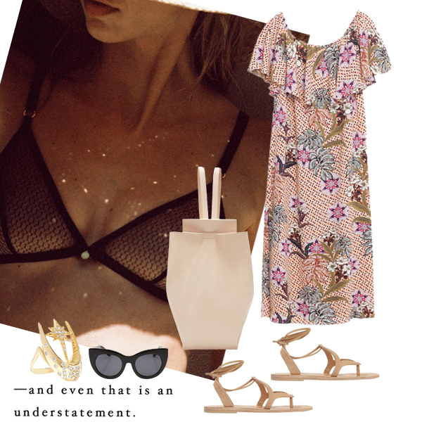 Φόρεμα ZARA. Σανδάλια Valia Gabriel, VALIAGABRIEL.COM. Τσάντα Chiyome, SSENSE.COM. Γυαλιά ηλίου OYSHO. Δαχτυλίδι Venyx, NET-A-PORTER.COM.