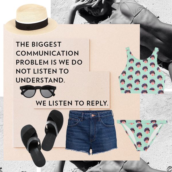 Mπικίνι Christina Economou, CHRISTINA-ECONOMOU.COM. Denim shorts H&M. Σανδάλια Zeus+Δione, ZEUSNDIONE.COM. Καπέλο Maison Michel, MATCHESFASHION.COM. Γυαλιά ηλίου Illesteva, NET-A-PORTER.COM.