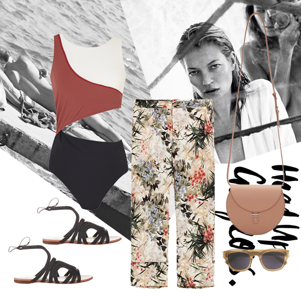 Ολόσωμο μαγιό Zeus+Δione, ZEUSNDIONE.COM. Παντελόνι ZARA. Τσάντα ώμου Pb 0110, SSENSE.COM. Σανδάλια Francesco Russo, MATCHESFASHION.COM. Γυαλιά ηλίου Saint Laurent, SAFILO.