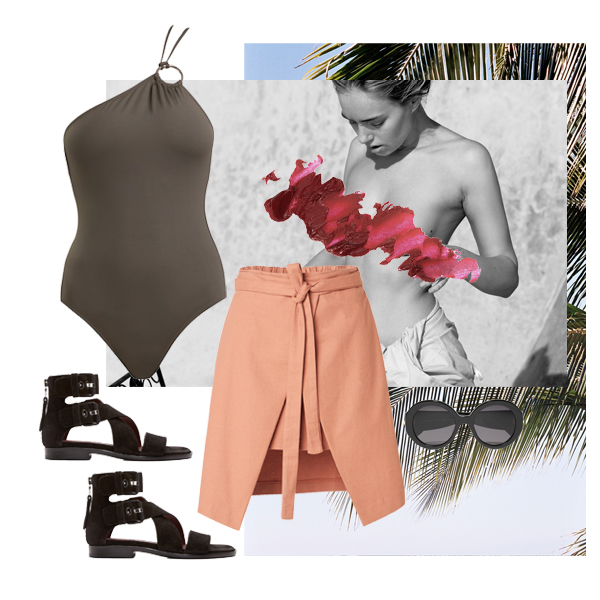 Ολόσωμο μαγιό Sophie Deloudi, AESTHET.COM. Wrap φούστα Vathos, VATHOSAPPAREL.COM. Σανδάλια Rag & Bone, SSENSE.COM. Γυαλιά ηλίου Alexander McQueen, NET-A-PORTER.COM.