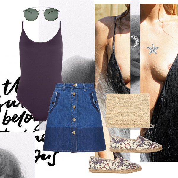Ολόσωμο μαγιό Maan, MAAN.GR. Denim φούστα Valentino, LUISA. Espadrilles Isabel Marant, LUISA. Ψάθινη τσάντα Heidi Klein, MATCHESFASHION.COM. Γυαλιά ηλίου Maison Margiela, SSENSE.COM. Σκουλαρίκια Marc Jacobs, FARFETCH.COM.