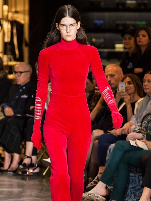 Ένα μοντέλο φοράει μία κόκκινη εκδοχή της Juicy Couture φόρμας κατά την διάρκεια του show υψηλής ραπτικής του οίκου Vetements. Ένα look που έκανε ακόμη και την Carine Roitfeld να θέλει να το φωτογραφίσει.
