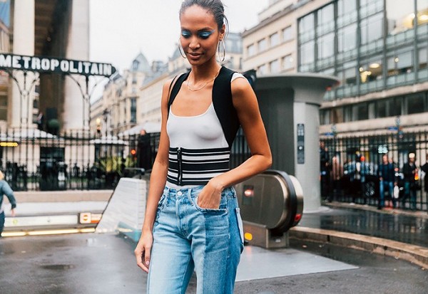 H Joan Smalls πρόσθεσε ένα sporty στοιχείο στο look της, χάρη στον ριγέ της κορσέ.