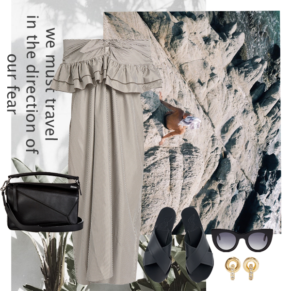 Off-the-shoulder φόρεμα Isa Arfen, MATCHESFASHION.COM. Τσάντα Loewe, MATCHESFASHION.COM. Σανδάλια Ancient Greek Sandals, ANCIENT-GREEK-SANDALS.COM. Γυαλιά ηλίου Thierry Lasry, SSENSE.COM. Σκουλαρίκια Elizabeth and James, NET-A-PORTER.COM.