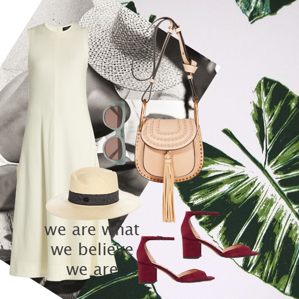 Φόρεμα Proenza Schouler, MATCHESFASHION.COM. Tσάντα ώμου Chloe, LUISA. Πέδιλα Sam Edelman, NET-A-PORTER.COM. Γυαλιά ηλίου Elizabeth and James, NET-A-PORTER.COM. Καπέλο Maison Michel, MATCHESFASHION.COM.