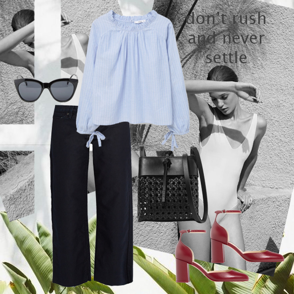 Τοπ MANGO. Παντελόνι Simon Miller, MATCHESFASHION.COM. Τσάντα ώμου Kara, NET-A-PORTER.COM. Ψηλοτάκουνα παπούτσια ZARA. Γυαλιά ηλίου ASOS, ASOS.COM.