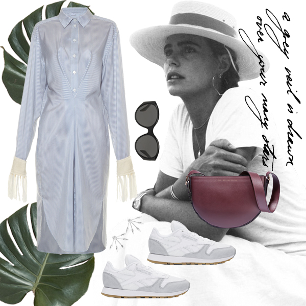 Shirtdress Loewe, MATCHESFASHION.COM. Τσάντα ώμου Victoria Beckham, NET-A-PORTER.COM. Sneakers Reebok Classics, REEBOK. Γυαλιά ηλίου Oliver Peoples, LUXOTTICA HELLAS. Σκουλαρίκια Pamela Love, SSENSE.COM.