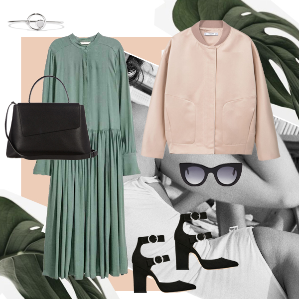 Bomber jacket MANGO. Φόρεμα, €49.99, Η&Μ. Τσάντα Valextra, MATCHESFASHION.COM. Ψηλοτάκουνα παπούτσια ZARA. Choker Eddie Borgo, NET-A-PORTER.COM. Γυαλιά ηλίου Thierry Lasry, SSENSE.COM.