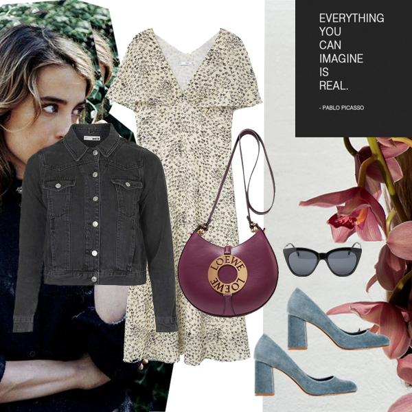 Φόρεμα, €49.99, MANGO. Denim jacket Topshop, TOPSHOP.COM. Tσάντα ώμου Loewe, NET-A-PORTER.COM. Βελούδινα παπούτσια ZARA. Γυαλιά ηλίου ASOS, ASOS.COM.