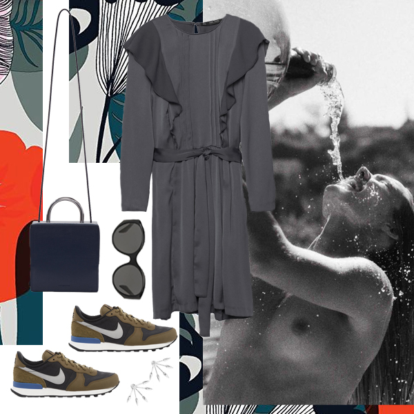 Φόρεμα, €39.95, ZARA. Τσάντα ώμου Building Block, SSENSE.COM. Sneakers NIKE. Σκουλαρίκια Pamela Love, PAMELALOVE.COM. Γυαλιά ηλίου Oliver Peoples, LUXOTTICA HELLAS.