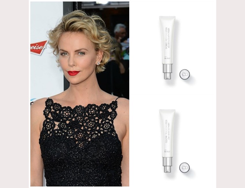 To μυστικό για την αλαβάστρινη επιδερμίδα της Charlize Theron κρύβεται σε δύο προϊόντα του οίκου Dior, το Dior Pore Minimizer Primer και το Dior Glow Maximizer – το οποίο το εφαρμόζει περιμετρικά και κυρίως στα ζυγωματικά.
